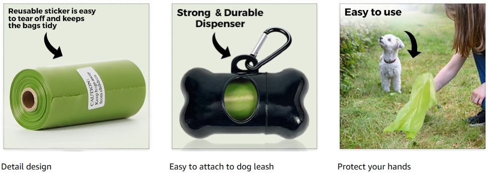- 【Easy Tear-off】- The doggie poop bags is with good toughness and breakpoint design and the bottom easy-tear hole seam for quick detach bag from the roll. When you’re on the go with your dog, you can enjoy stress-free outdoor walks with your dog!