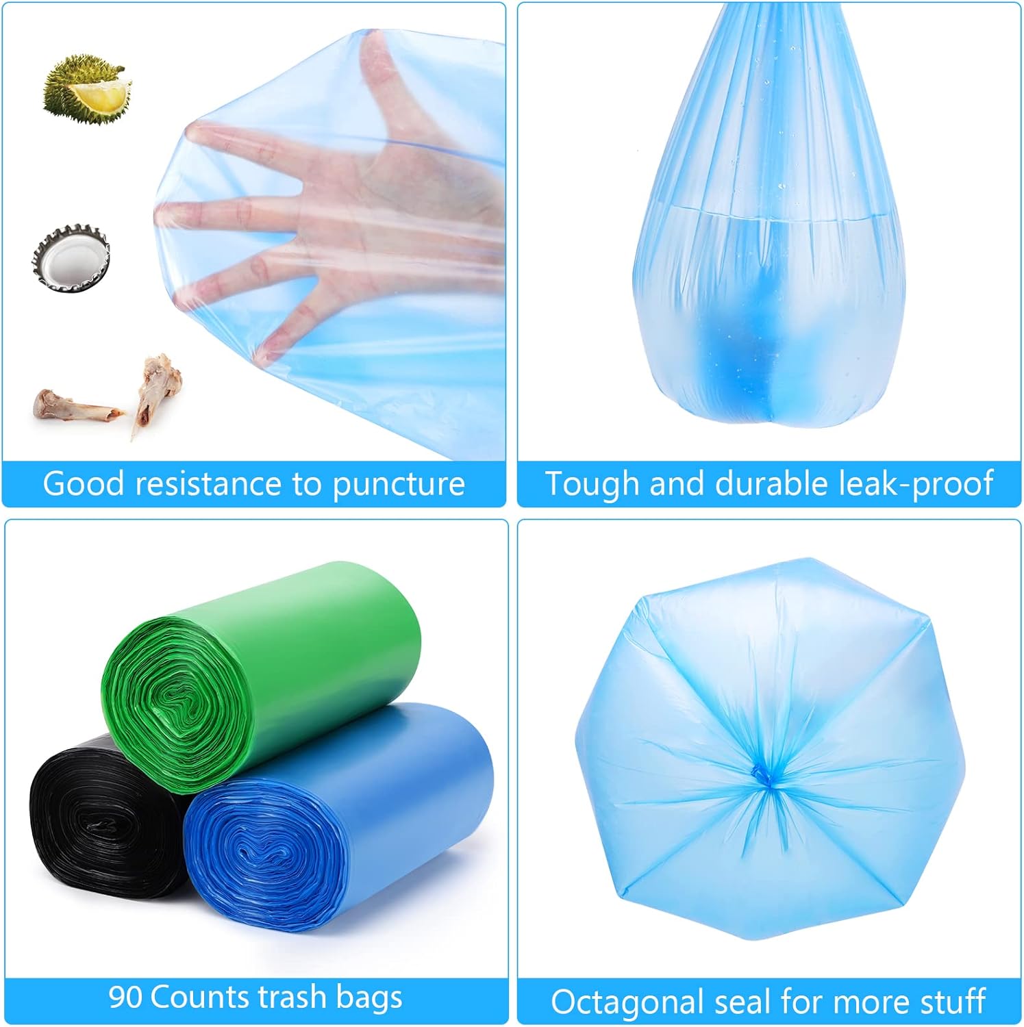- 【Strong and Leak Proof Small Trash Bags】 These small trash can liners bottom octagonal design leave no space to leak, constant temperature sealing process to lock various leaks,our small trash can bags no breakable and excellent resistance to tearing.Please avoid sharp stuff.