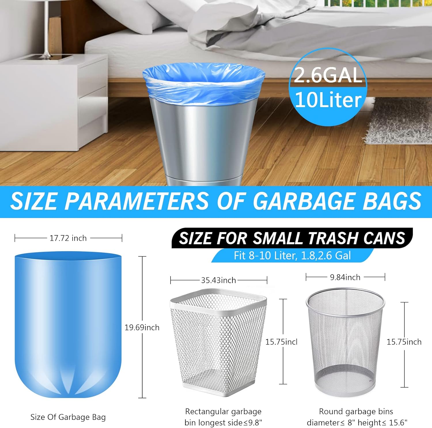 - 【Perfect 4 Gallon Trash Bag】19.5 inches * 23 inches, Up to 15 L, fit for 4-6 gallon small trash can, No only reach to the bottom but also fit over the edge to secure, 4 gallon small garbage bags small but thick enough for storing dailywaste but avoiding sharp stuffs.